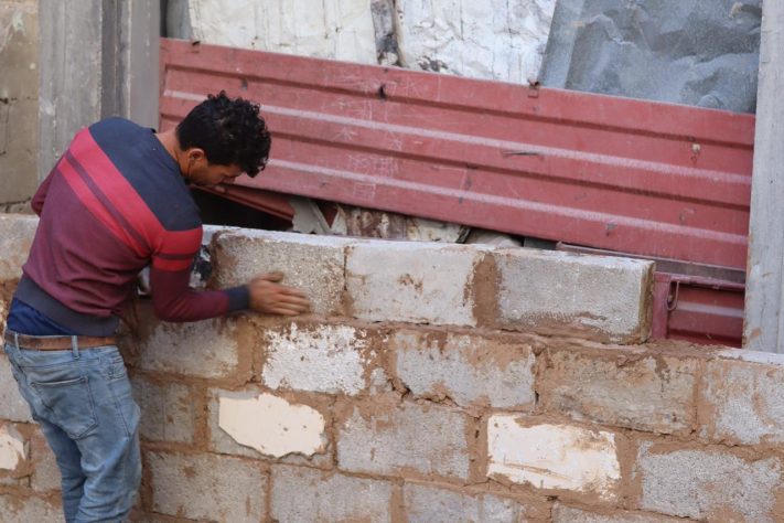 Proses pembangunan dimulai dengan membersihkan puing-puing bangunan. Keluarga mengumpulkan batu yang masih dapat digunakan kembali.