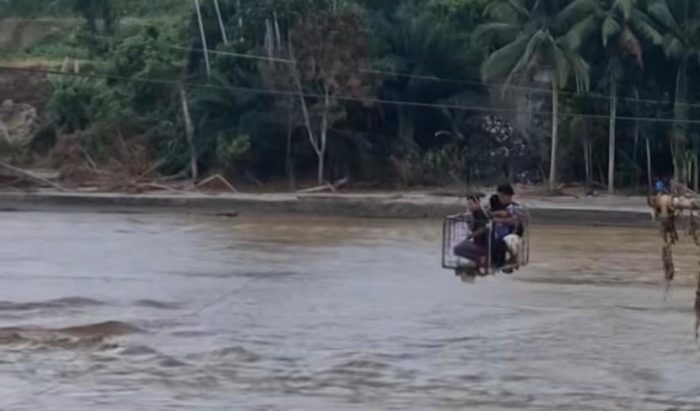 Momen Ayah Peluk Anak Saat Menyebrangi Jembatan Rusak Akibat Banjir