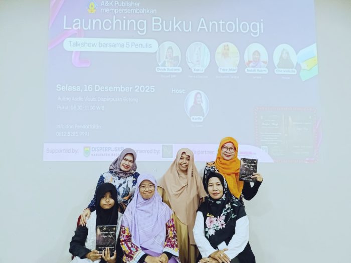UPAYA penguatan budaya literasi terus digalakkan di Kabupaten Batang. Salah satunya melalui kegiatan Talkshow dan Peluncuran Buku Antologi berjudul Tanpa Ucap, Tapi Bisa Dirasa yang diselenggarakan oleh A&K Publisher bersama lima penulis: Indah Puspita Rukmi, Dinok Sudiami, Triez Mila, Xue li, dan Cho Violette, bekerja sama dengan Dinas Perpustakaan dan Kearsipan (Disperpuska) Kabupaten Batang, Selasa (16/12/2025) bertempat di Ruang Audio Visual Disperpuska Batang, Jalan Wahidin, Kauman, Kec. Batang, Kabupaten Batang, Jawa Tengah.