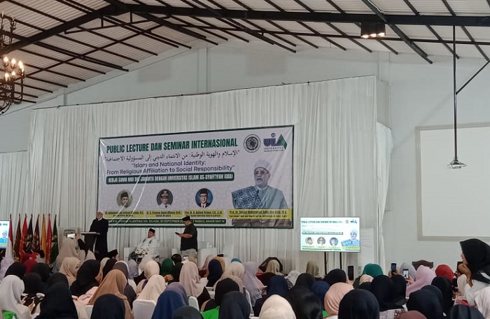 PROF. Dr. Syeikh Muhammad Salim Abu ‘Ashi, M.A. menyampaikan pemaparannya mengenai Islam dan Identitas Nasional dari afiliasi Agama menuju tanggung jawab sosial dalam seminar internasional yang diselenggarakan oleh Universitas Islam As-Syafi’iyah dengan MUI DKI Jakarta, pada Selasa (30/9/2025).