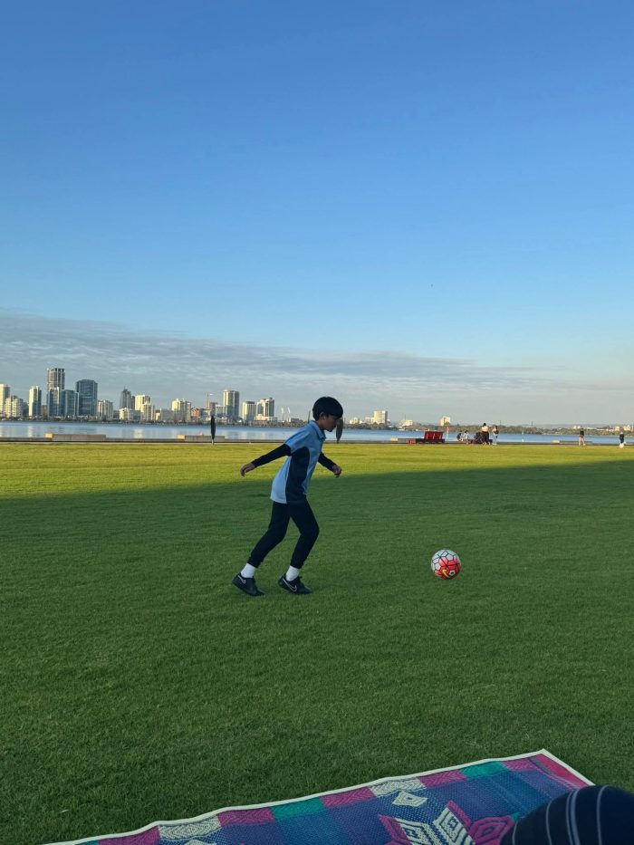 Lalu setelah pulang sekolah, mobil aku arahkan ke South Perth ke lapangan rumput dekat tepi pantai gitu deh, sambil ngobrol ngasih makan anak yang baru pulang sekolah, hmm aku bawa bekal: bakso, donat, nasi goreng bumbu barbeque, ayam saus tomat, kerupuk, sambal tomat dan ikan teri ~ beli di toko Oriental shop – Juice pineapple. Wah enak deh.