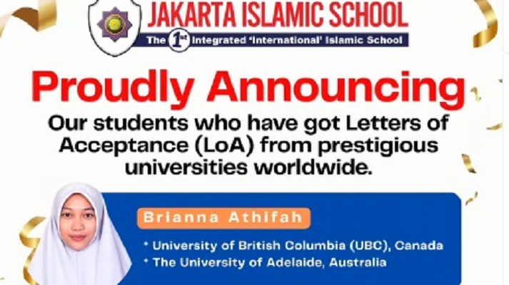 PRESTASI membanggakan kembali diraih oleh para siswa JISc (Jakarta Islamic School) yang berhasil mendapatkan Letter of Acceptance (LoA) dari berbagai universitas bergengsi di dunia.