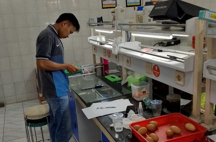 Mereka mencelupkan telur segar dari peternakan UMM ke dalam larutan selama lima detik. Selanjutnya, mereka menyimpan telur itu selama 14 hari.